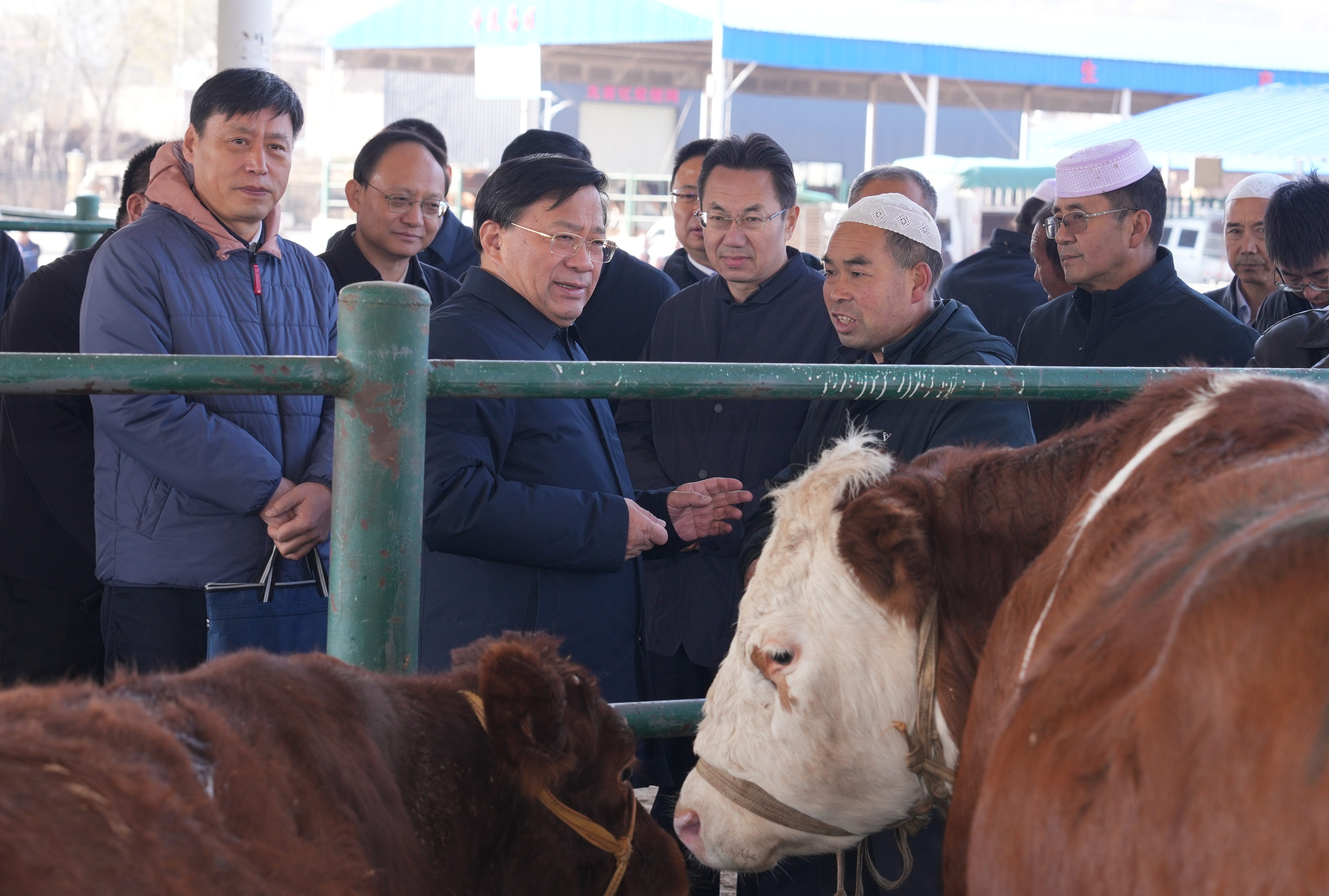 肉牛肉羊是甘肅的主導(dǎo)產(chǎn)業(yè)之一,韓俊來(lái)到臨夏州康樂(lè)縣牛羊交易市場(chǎng),與市場(chǎng)負(fù)責(zé)人、經(jīng)紀(jì)人、飼料經(jīng)銷(xiāo)商、養(yǎng)殖戶(hù)等交流,詢(xún)問(wèn)市場(chǎng)行情、養(yǎng)殖收入、飼草供應(yīng)、屠宰加工等情況。他還來(lái)到附城鎮(zhèn)劉家廟村鑫隆肉牛養(yǎng)殖合作社,調(diào)研了解肉牛養(yǎng)殖情況。得知去年以來(lái)甘肅針對(duì)肉牛養(yǎng)殖虧損,出臺(tái)一系列有力有效政策舉措,養(yǎng)殖場(chǎng)戶(hù)普遍實(shí)現(xiàn)盈利,韓俊予以肯定。他強(qiáng)調(diào),要健全良種繁育體系,抓好肉牛肉羊品種改良,全環(huán)節(jié)推進(jìn)肉牛肉羊產(chǎn)業(yè)高質(zhì)量發(fā)展。要發(fā)展優(yōu)質(zhì)飼草料生產(chǎn),提高標(biāo)準(zhǔn)化規(guī)模化養(yǎng)殖水平。要切實(shí)抓好養(yǎng)殖糞污處理,采取糞肥還田、生產(chǎn)有機(jī)肥等方式進(jìn)行資源化利用,促進(jìn)種養(yǎng)循環(huán)發(fā)展。要毫不松懈抓好重大動(dòng)物疫病防控,嚴(yán)格檢疫監(jiān)管,保障產(chǎn)業(yè)持續(xù)健康發(fā)展。