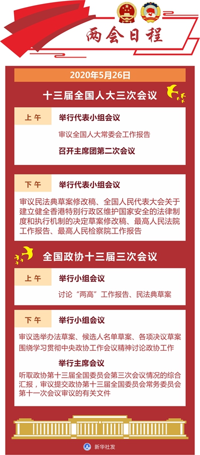 新華社北京5月25日電 十三屆全國人大三次會議26日上午舉行代表小組會議,審議全國人大常委會工作報告;11時召開主席團第二次會議。下午舉行代表小組會議,審議民法典草案修改稿、全國人民代表大會關于建立健全香港特別行政區維護國家安全的法律制度和執行機制的決定草案修改稿、最高人民法院工作報告、最高人民檢察院工作報告。